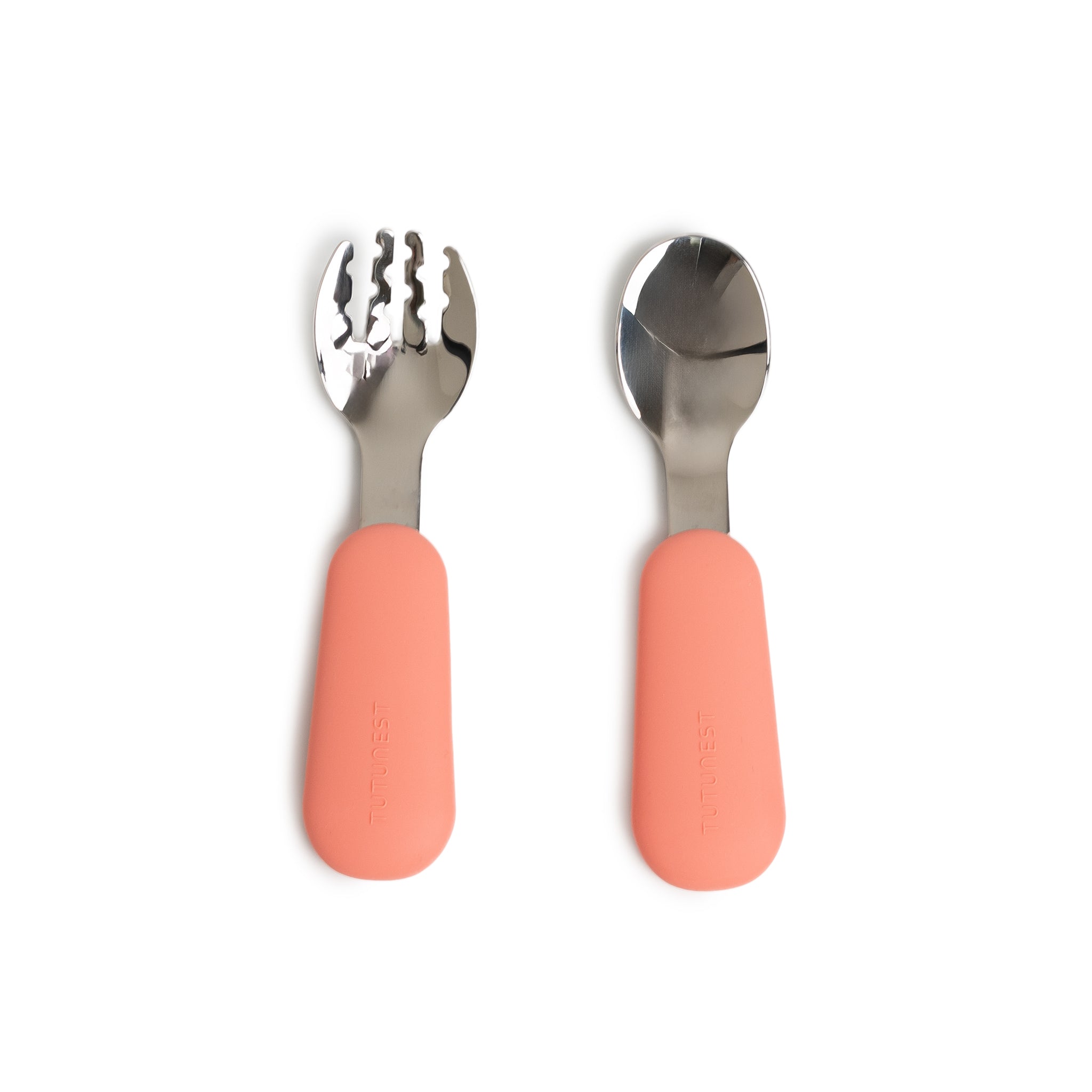 Bestikket kombinerer mykt silikon med solid, rustfritt stål – slik at det er enkelt for barnet å spise selv.