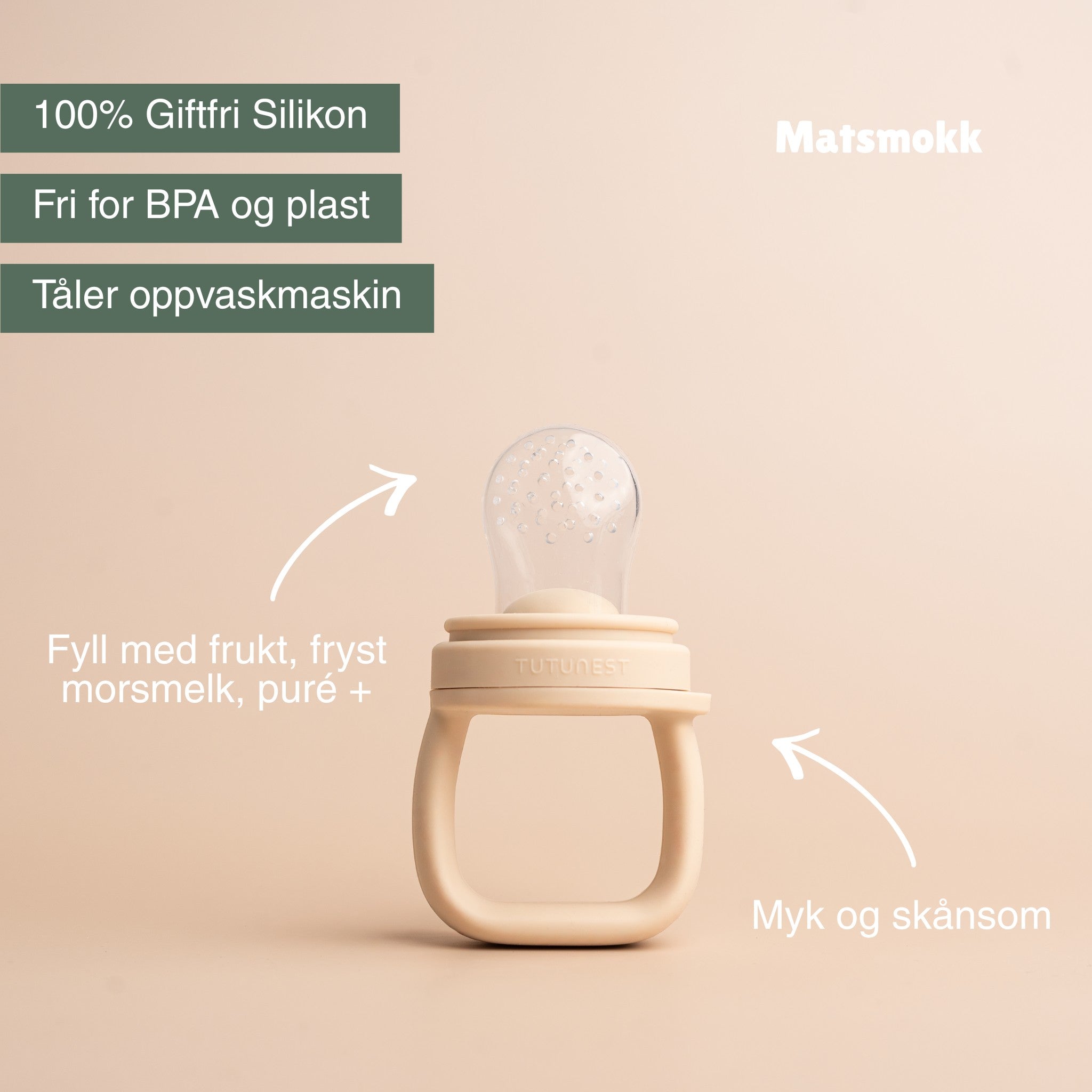 Gi babyen en trygg og morsom start på nye smaker med vår matsmokk i LFGB-sertifisert silikon. Små hull slipper gjennom akkurat passe mengde mat eller væske, slik at babyen kan utforske i eget tempo - uten kvelningsfare. Perfekt til myk frukt, bær og andre smakstester, eller frosne biter av puré for lindring når tennene er på vei.