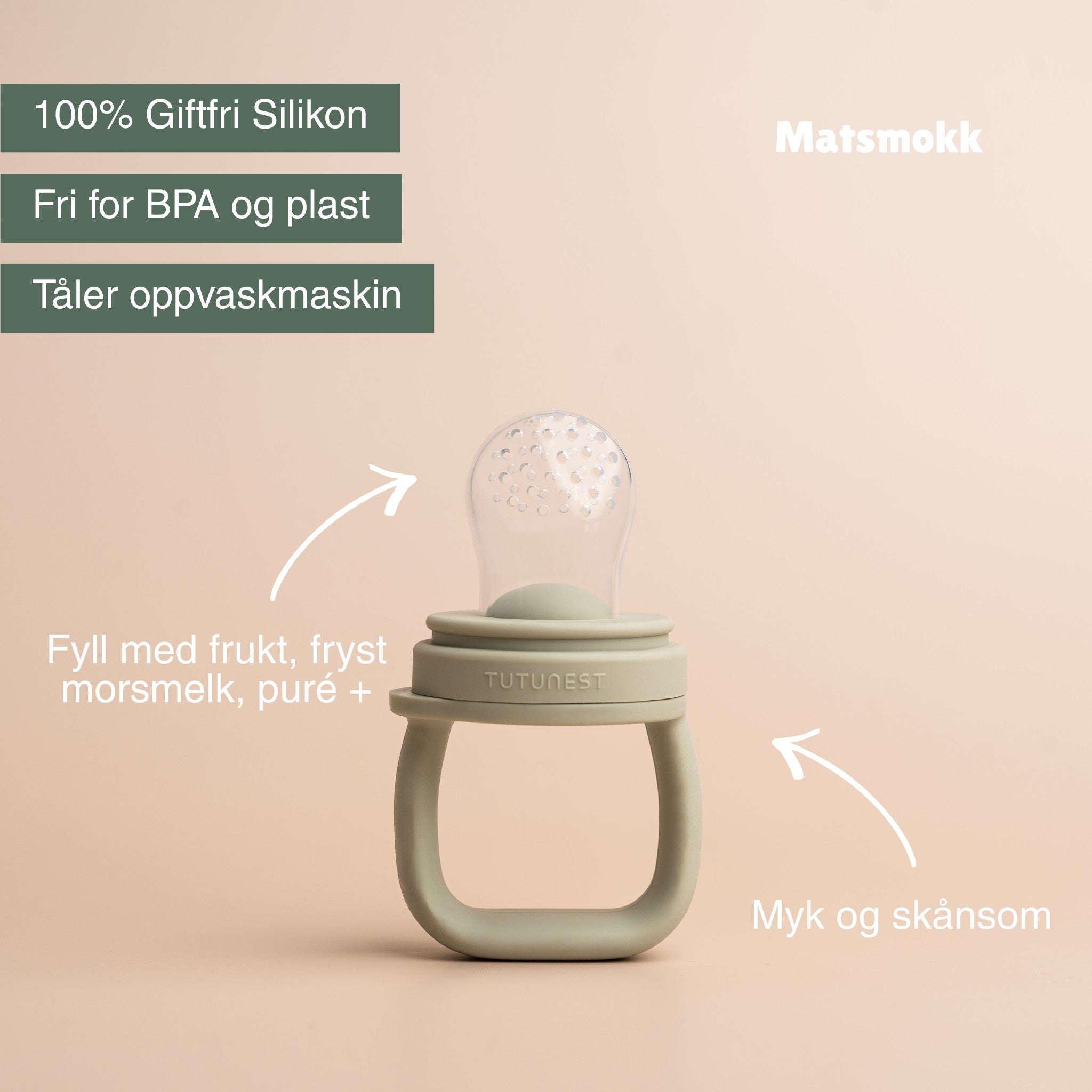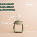 Gi babyen en trygg og morsom start på nye smaker med vår matsmokk i LFGB-sertifisert silikon. Små hull slipper gjennom akkurat passe mengde mat eller væske, slik at babyen kan utforske i eget tempo - uten kvelningsfare. Perfekt til myk frukt, bær og andre smakstester, eller frosne biter av puré for lindring når tennene er på vei.