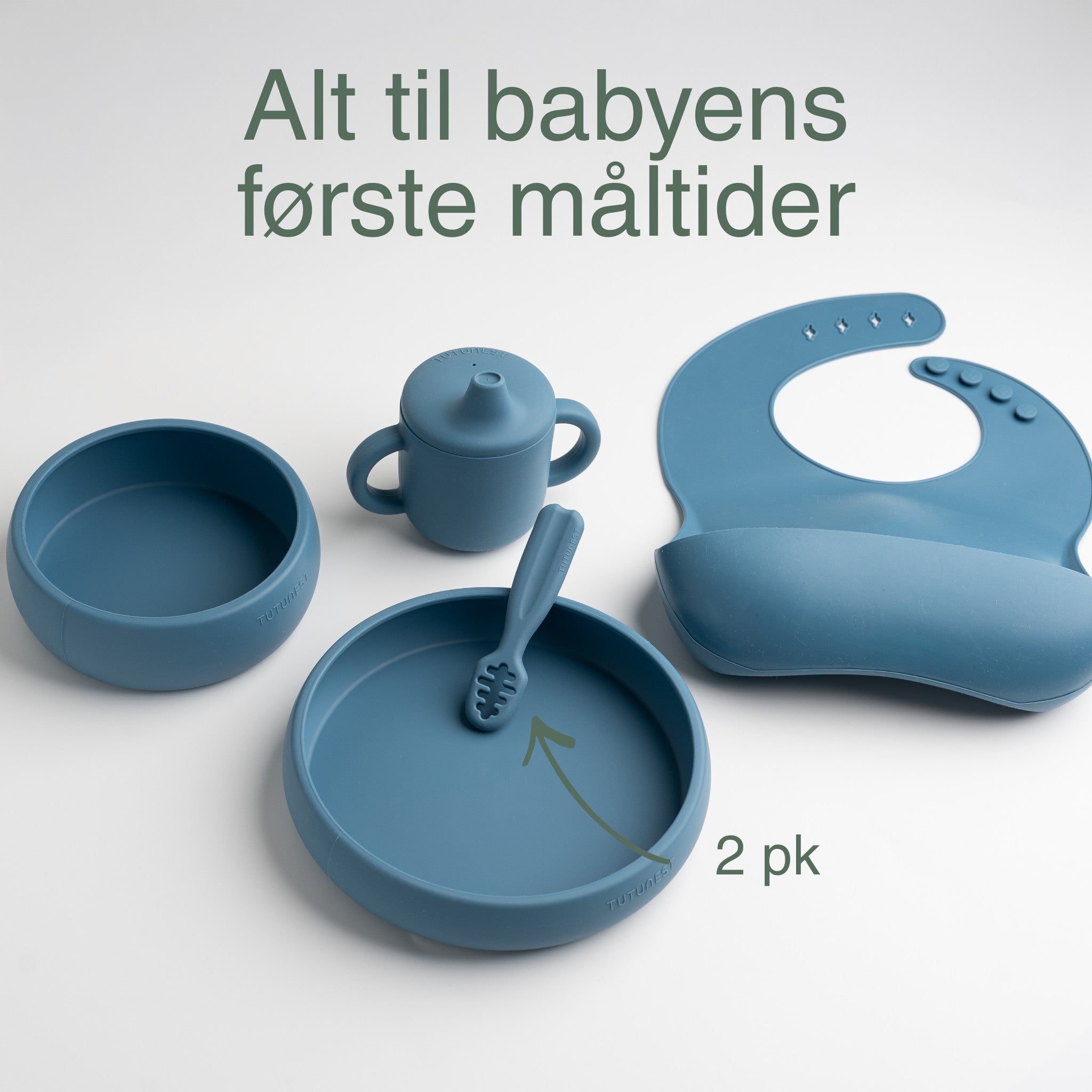 - Innhold i pakken: Tutekopp i Silikon (150ml), Barneskål i Silikon, Barnetallerken i Silikon, Smekke i Silikon, Sett med Treningsskjeer i Silikon