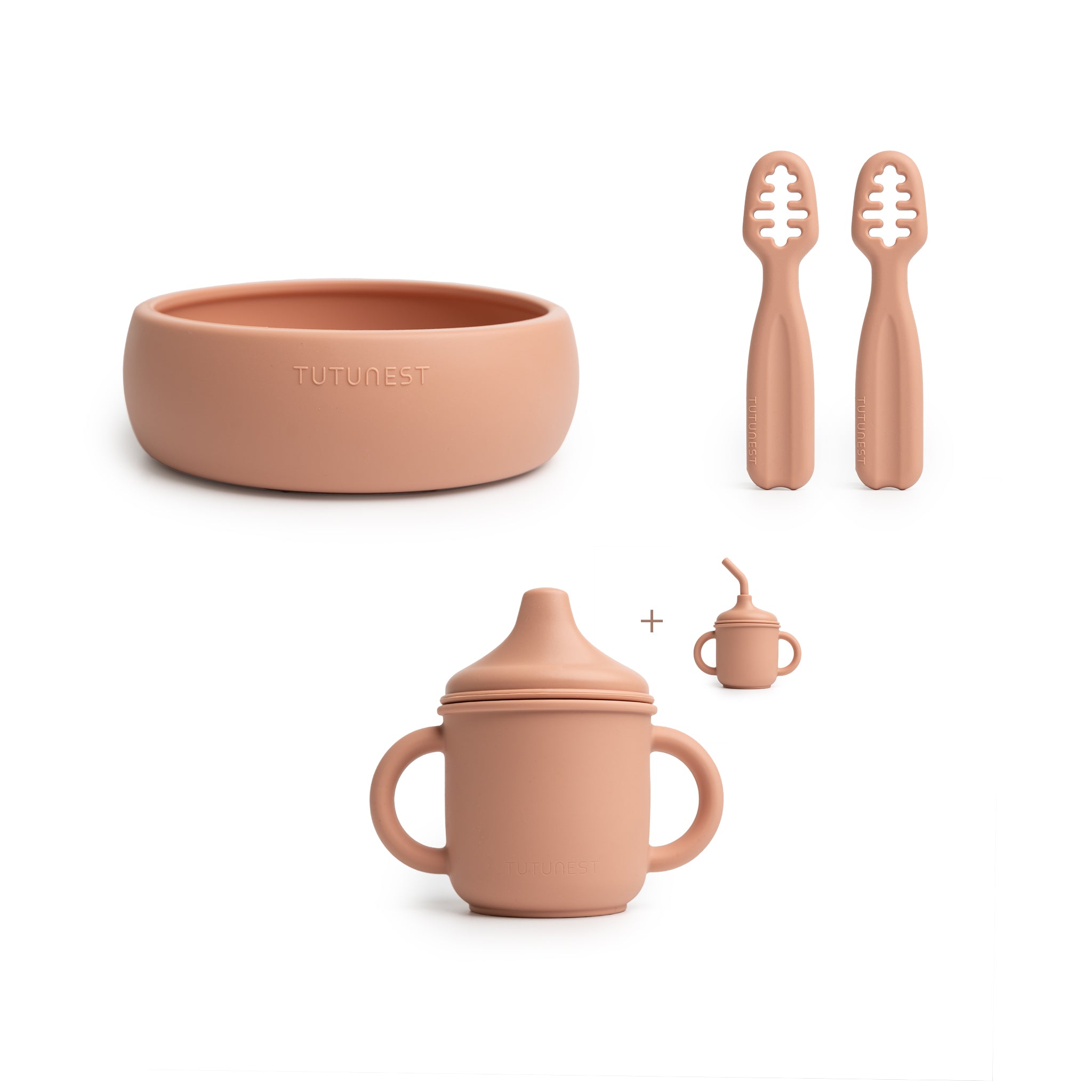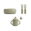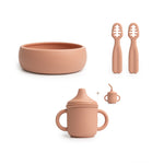 - Innhold i pakken:– 1 barnekopp i silikon (150 ml) med sugerør og lokk– 1 barneskål i silikon– 2 treningsskjeer i silikon